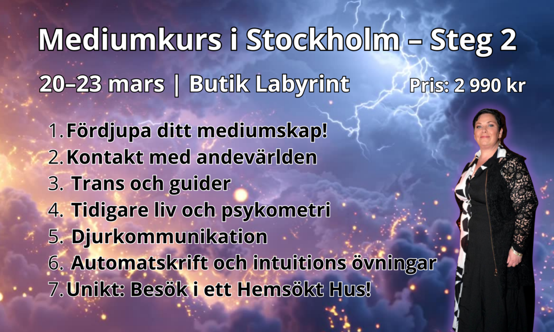 Denna exklusiva kurs riktar sig till dig med tidigare medial erfarenhet som vill ta nästa steg – exempelvis mot certifiering eller vidareutveckling oavsett du har gått kurs tidigare hos Karin Dahlqvist och Pehr Trollsveden eller något annan lärare.